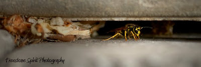A busy little nest in our garden. By using an extension tube on my Canon 100-400mm L lens I had enough space as not to expect a stinging (sort of anyways). All of these images have been processed to HDR and blended back with the optimized single image. This gives a greater sense of depth in a very high contrast scene.